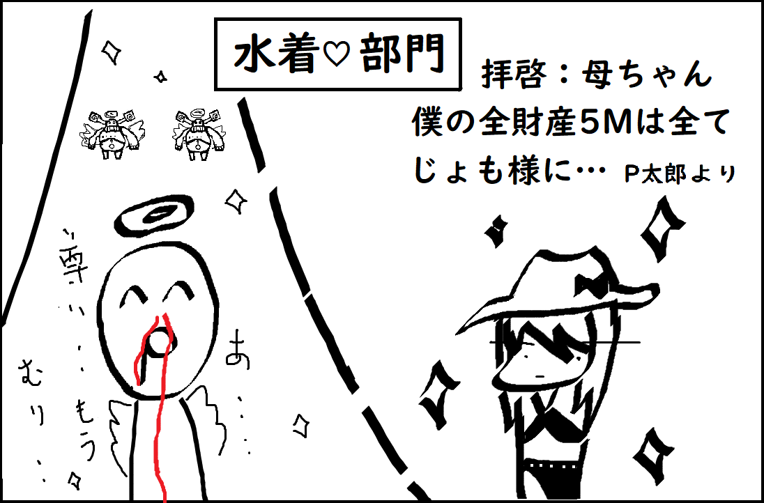 ラシエスター★出張版~inチムイベ~ ヤマト 2020/08/28 19:38 カテゴリ:4コマ漫画ラシエスター★ シエスタのチムイベ出張版~★【ファッションショーだよ!】この後、ムーンで起こされた★【登場人物】P太郎ド田舎鯖から1鯖に遊びに来たアークスチーム La siesta に入団し彼の波乱万丈なアークスライフが始まった。全財産5Mモノマネ部門のじょもさんセクシーイルフォイエ※じょもさんはモノマネ部門に出ていませんラッピー部門のじょもさん必殺技:ラッピーソング(尊死)水着部門のじょもさん漆黒の死神(死因:鼻から鼻血ブーブー)サポーターズリンク投票よろしくお願いします!次回:出張版!最終回!!!楽しいチムイベファッションショーも大詰め!!!えっおわるの早くない!?!!!更新は未定!!! 「4コマ漫画」カテゴリの最新記事 「ラシエスター★」カテゴリの最新記事 コメントする コメントフォーム 名前 コメント 評価する リセット リセット 顔 星 投稿する 情報を記憶