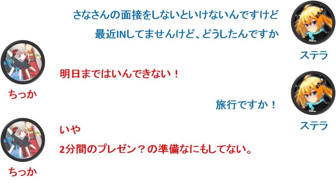 と言う事で、面接にはチームマスターが必須です。ちっかさんを呼び出したんですが・・・2日ぐらいINしてなかったので、