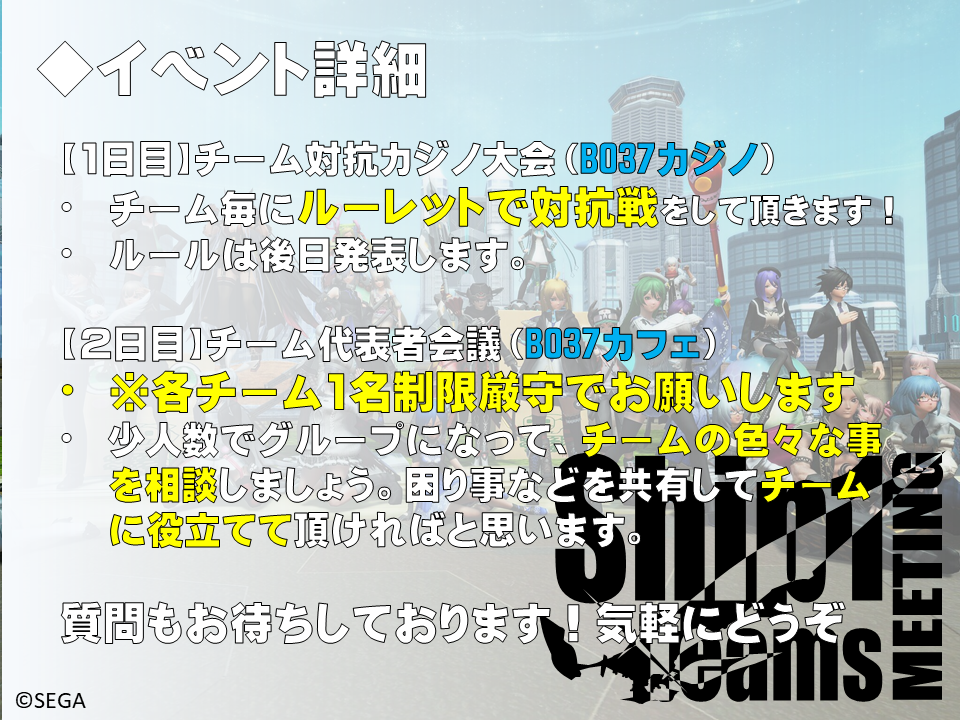 前回は人数制限させて頂いたのですが、今回は人数無制限!1鯖チームな皆様、是非是非お越し下さい。(2日目は各チーム1名)
