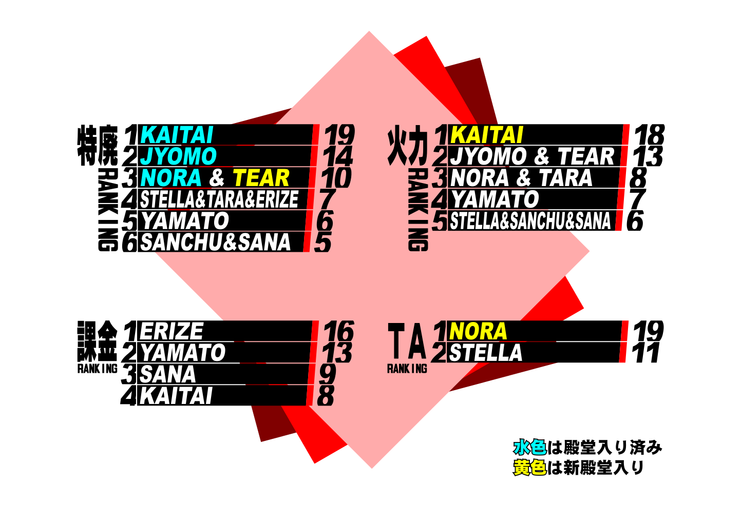 特に廃ランキングはいままでの殿堂入りの方々がトップ独占という順当な結果に。あとは誤差ですね。