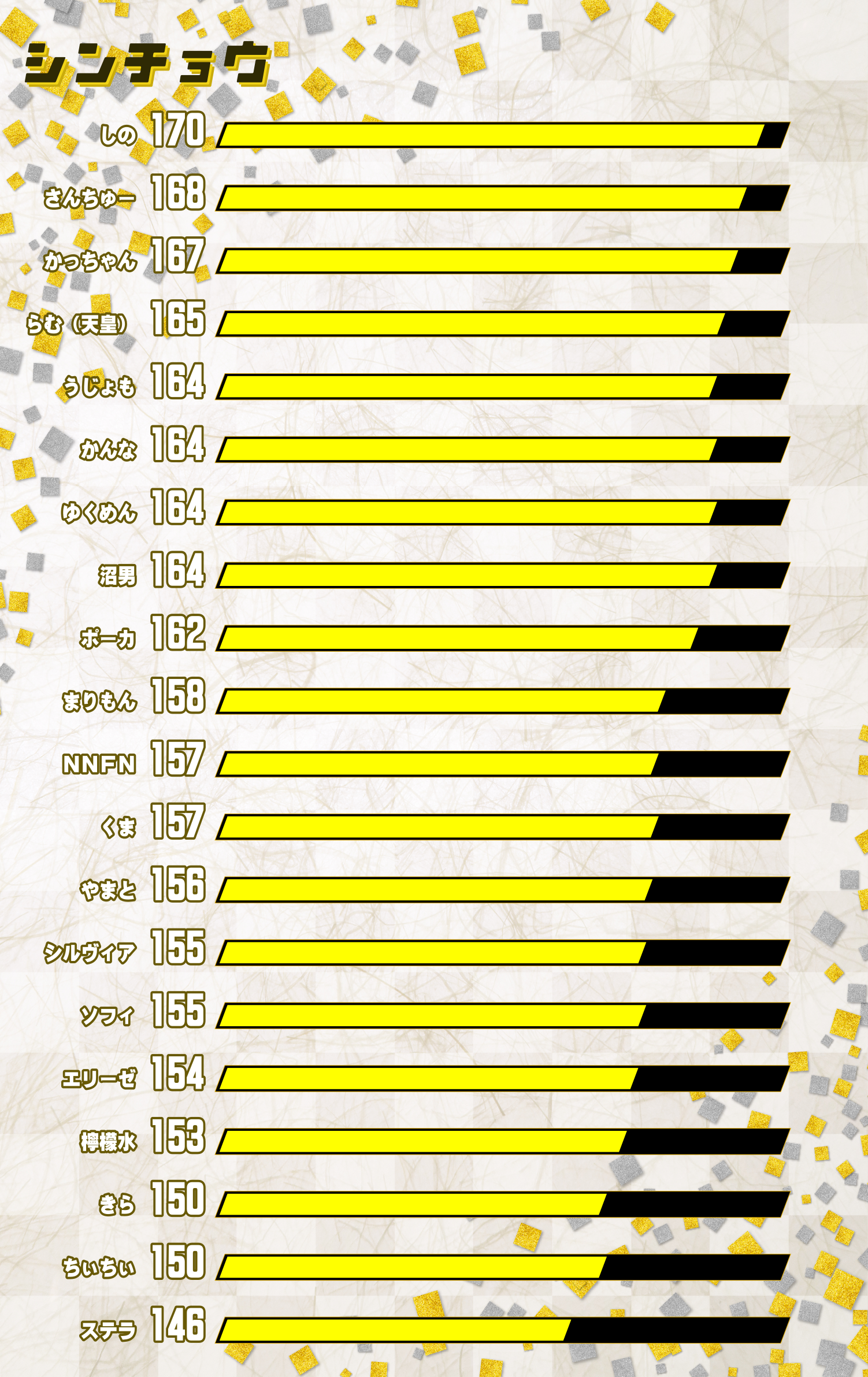 ランキングがエリーゼさんが総なめするというもはや機能してない状態でしたので、クソランキングから選ばれてきっと嬉しいランキングに。